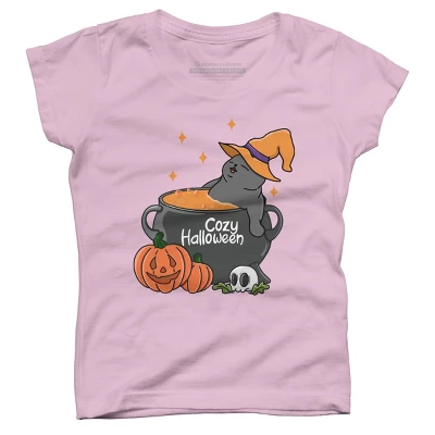 - This magically cozy design features a black cat in a witch hat relaxing in a bubbling cauldron surrounded by stars, jack-o-lanterns, and a skull with the text “Cozy Halloween”.