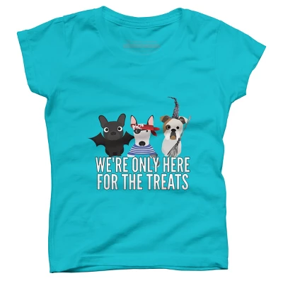 - This dog-gone awesome Halloween design features three cartoon dogs dressed as a bat, pirate, and witch with the text “We’re Only Here For The Treats”.