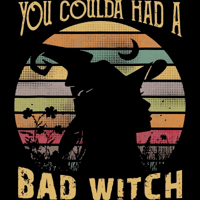 - Cast a spell with this Halloween design featuring a vintage sunset silhouetting a witch in a field of flowers and a cresent moon with the text “You Coulda Had A Bad Witch”.