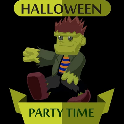 - Get ready for fright night with the cool Halloween design featuring a catroon Frankenstein and the text “Halloween Party Time”.