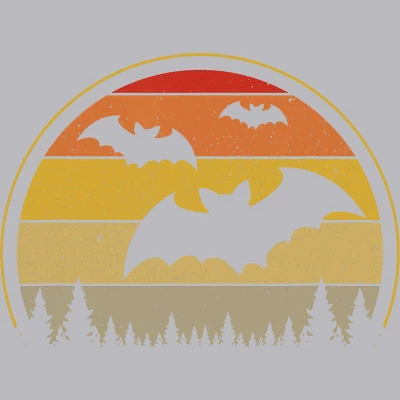 - Be bat to the bone with thie cool Halloween design featuring the silhouettes of three bats flying over a pine tree forest illuminated by a vintage sun.