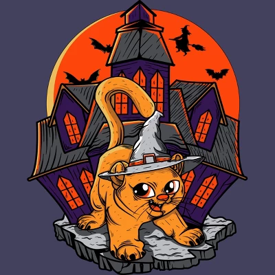- This purr-fect Halloween design features a cute cat in a witch hat in front of of a haunted house surrounded by bats and a witch on a full moon night.