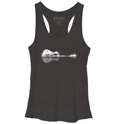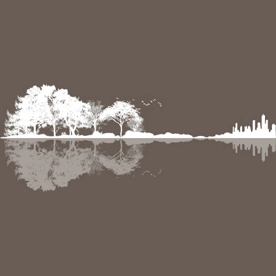 - Rock out with this wonderful design featuring a forest silhouette reflecting into water creating a guitar shape while birds fly in the distance.